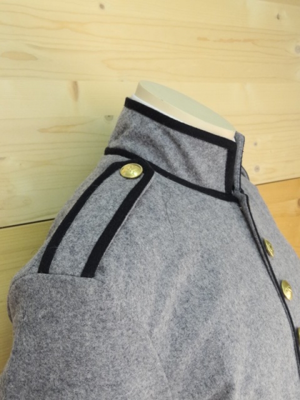 schwarze Paspelierung am Arm, Kragen, Schulterklappen an der sichtbaren Knopfleiste und hinten am sichtbaren Rockschoß