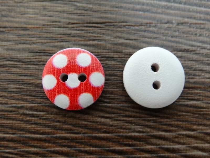 Holzknopf weiß / rot mit weißen Punkten, 2 Loch, ca. 1,5 cm, Preis pro Stück