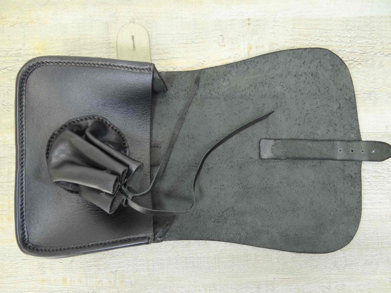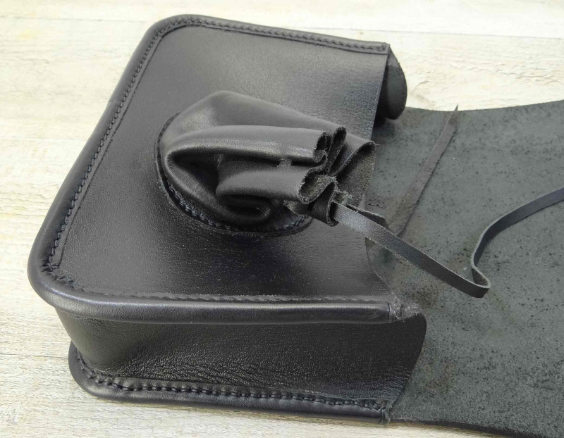 Die Patronentasche kann mit dem weißen Lederriegel an den Lederknopf des Säbelriemens geknöpft werden