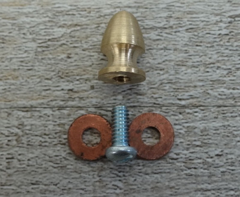 Finial für Patronentasche, Länge 1,9cm, Durchmesser Knubbel 1,1 cm, Material: Messing, Unterlegscheibe Kupfer, Schraube EisenMaterial: Messing, Unterlegscheibe Kupfer, Schraube Eisen 8,00 EUR pro Stück | |
